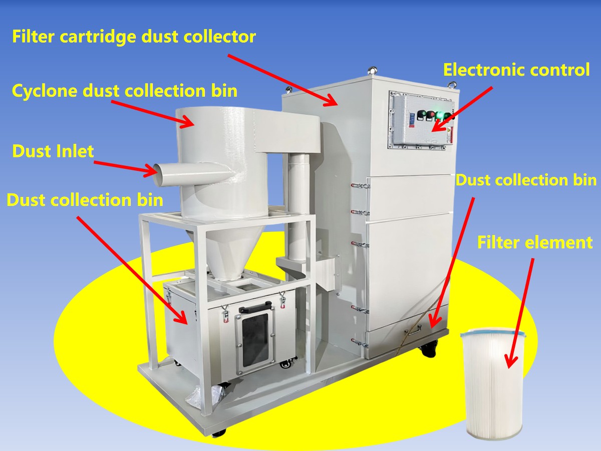Cyclone Pre-filter Cartridge Dust Collector kombinerer grovseparasjonsevnen til en syklonseparator med de fine filtreringsfordelene til et patronfilter.
